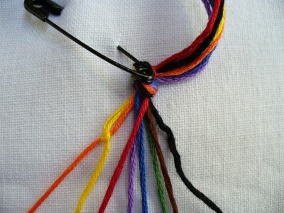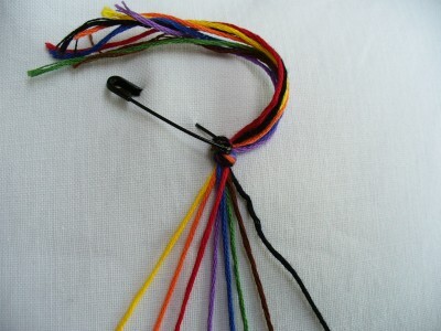 Od každej bavlnky si odstrihneme jednu niť cca 1 metra a na konci ich zviažte uzlíkom. Do neho zapichneme svorku, ktorú si niekam uchytíme.