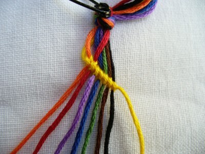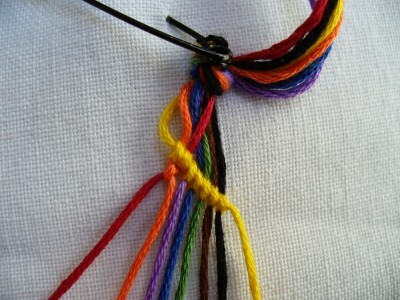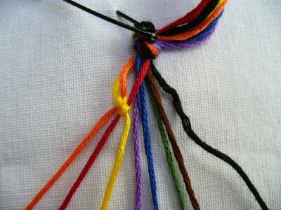 Takto pokračujeme až kým náramok nemáme dostatočne dlhý. Na konci úrobíme cop, rovnako aj na druhom konci, kde vytvorený uzol rozviažeme. Náramok priateľstva tak máme hotový.