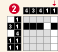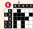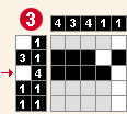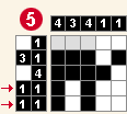 5.Môžete vidieť, že v druhom stĺpci má byť podľa legendy číslo 3, ktoré zatiaľ pozostáva len z dvoch štvorčekov. Nemôžete presne určiť, ktorý bude ten tretí vyfarbený štvorček, ale to čo môžete určiť je, že v druhom stĺpci posledný štvorček vyfarbený nebude, lebo trojka tam zasahovať určite nebude. Teraz sa pozrite na štvrtý riadok, kde je potrebné, aby boli vyfarbené dve políčka, medzi ktorými má byť medzera. Vidíte, že sú voľné už len tie dve políčka, tak ich vyfarbite. Keďže máte mať v stĺpcoch dve štvorky, vyfarbite aj políčka medzi vyfarbenými políčkami v prvom a treťom stĺpi. V prvom a treťom stĺpci teraz už 4 štvorčeky vyfarbené sú a preto posledné miesta označte.