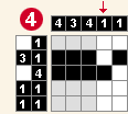 4.Vo štvrtom stĺpci môžete vidieť, že číslo legendy 1 je už vo štvorčekoch. Zvyšné štvorčeky daného stĺpca môžeme vyplniť bodkami alebo krížikmi.