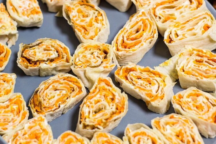 Zložte spodný okraj lavaša na mrkvovú zmes a pevne zrolujte. Rolku prekrojte v strede na polovicu a orežte oba konce po okraj mrkvovej plnky (čiže tak, aby bolo vidno mrkvu). Potom každú polovicu nakrájajte na dve časti. Znamená to, že z jedného lavaša získate 4 malé porcie.