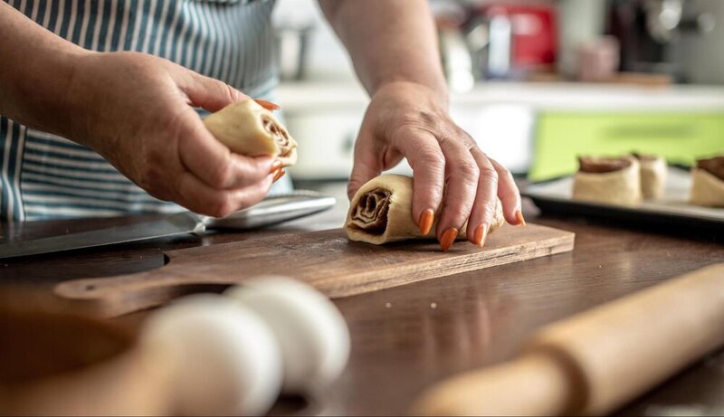 Rolky potrite trochou oleja a posypte zvyšným škoricovým cukrom. Vložte na plech a pečte 6-8 minút, alebo kým okraje nie sú mierne chrumkavé. Ihneď ich odložte do boxu, aby nevychladli.