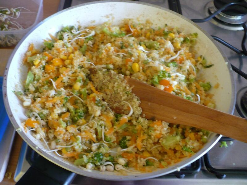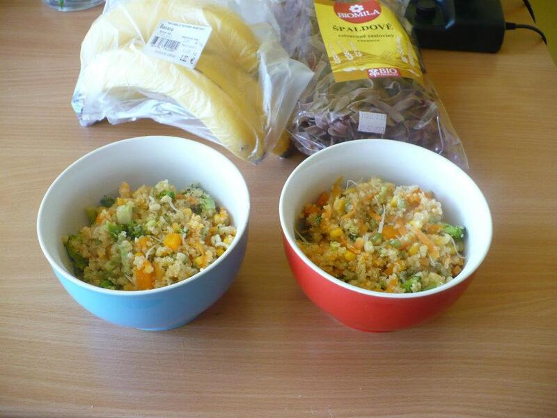 5.Pridáme uvarenú quinou, brokolicu a na kocky pokrájanú papriku. Maškrtné jazýčky môžu pridať kukuricu.