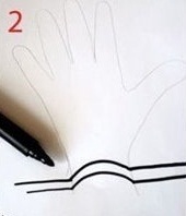 Urobíme obrys svojej ruky ceruzkou. Po bokoch ruky kreslíme rovné čiary a vo vnútri ruky robíme oblúčiky.2.