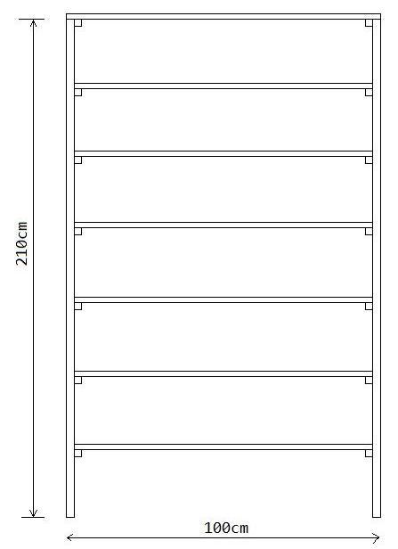 2.Miestnosť si samozrejme premeriame a veľkosti si prispôsobíme našim potrebám. V našom prípade budeme stavať nasledujúci regál podľa rozmerov uvedených na obrázku.
